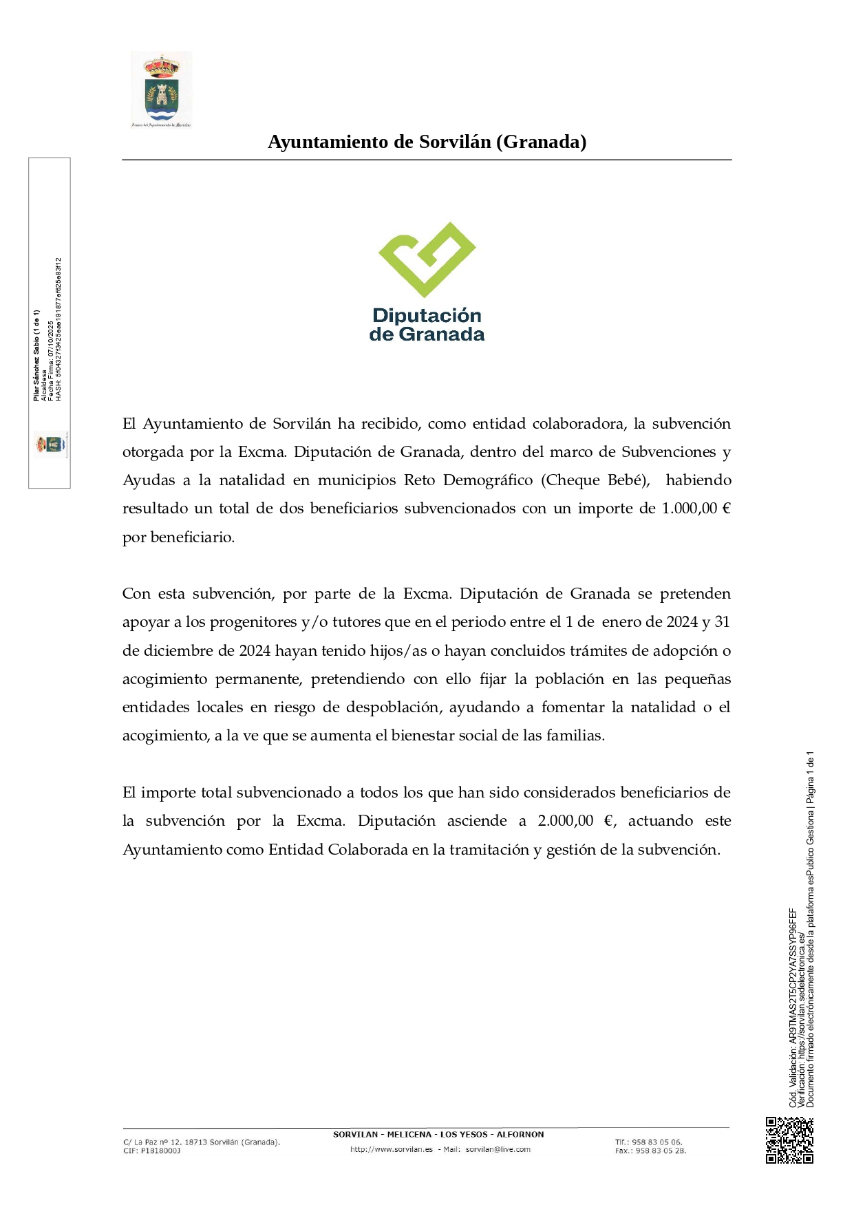 El Ayuntamiento de Sorvilán ha recibido, como entidad colaboradora, la subvención